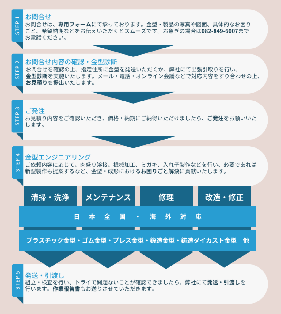 弊社は、1937年の創業以来、約90年にわたり、金型のメンテナンス・修理・改造や設計・製作を通して、成形における様々なお困りごと解決に貢献してまいりました。